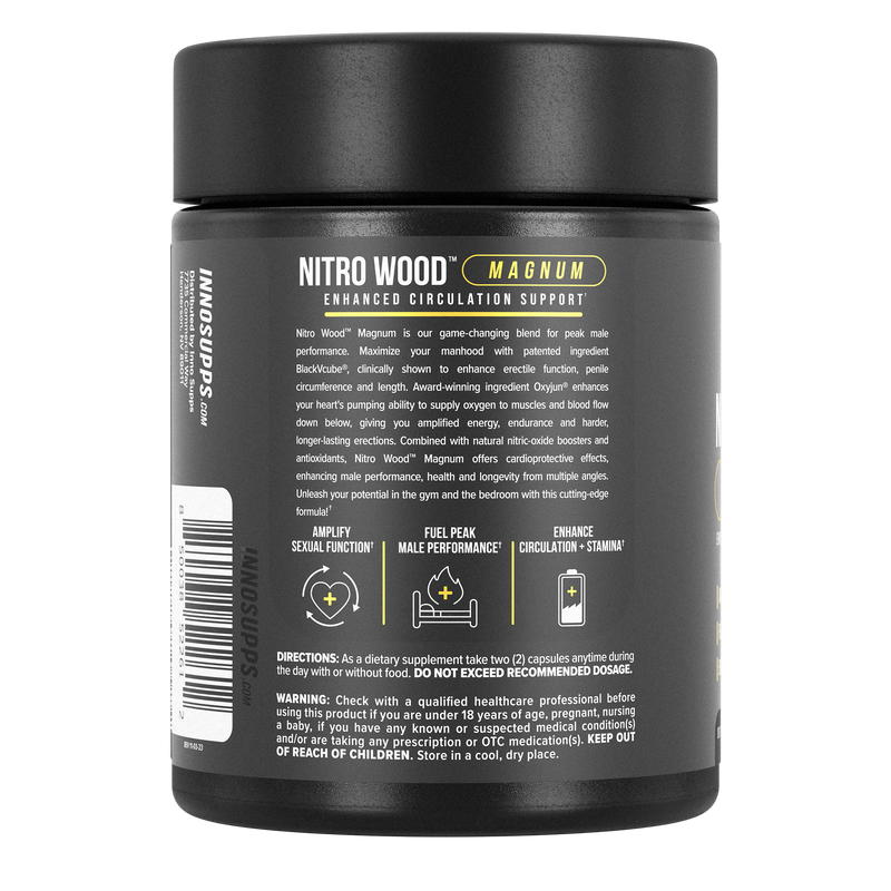 Nitro Wood™ Magnum?Nitro Wood™ Magnum contains a clinically effective dose of 50mg of BlackVCube® at a 4% concentration. In a human clinical trial, male subjects who consumed 90 mg of BlackVCube® at a 2% concentration for 60 days experienced a significant increase in length, circumference and response time. By using a highly concentrated form of BlackVCube®, Nitro Wood™ Magnum exceeds the clinically effective dose with just 50mg.*