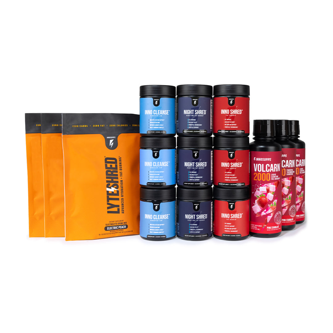 Start your day with Inno Shred™ to fire up your metabolism and target stubborn fat. Combine it with Volcarn 2000 to double down on the fat-burning effects and keep the metabolism boost going all night with Night Shred Black.* -