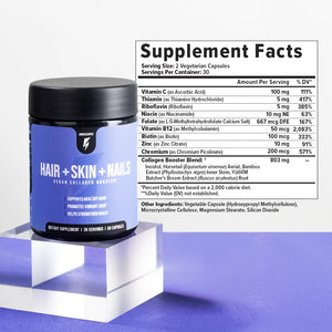 How many bottles of Hair + Skin + Nails should I buy?Although users typically see results within 30 days, the reported effects get better after 3-6 months of continuous use, which allows the body to stimulate more collagen production and optimize hair and nail growth and nourished skin. We recommend stocking up on a minimum of 3 bottles — however, many of our customers get 6 bottles to see enhanced benefits over time and to take advantage of the bundled discount pricing.*Is Hair + Skin + Nails vegan?There are no absolutely no animal products, dairy or milk derivatives in Hair + Skin + Nails. This means NO GMOs, soy, eggs, dairy, gluten, milk, peanuts, shellfish, tree nuts, wheat, yeast, artificial flavors or artificial colors. Our capsules are even veggie!* -