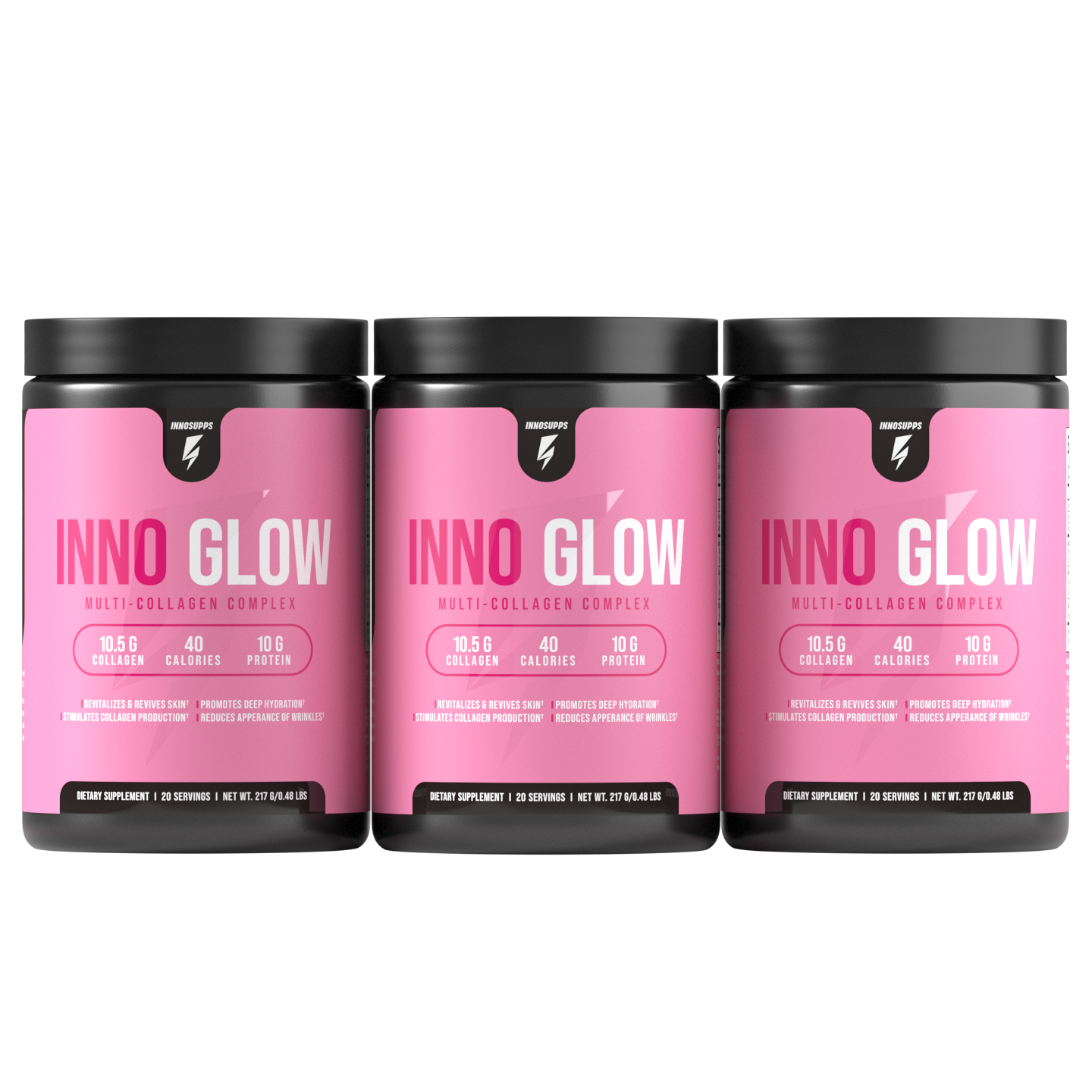 Inno Glow is different from other collagen supplements on the market because it contains type I, II and III collagens PLUS the cutting-edge ingredient Astrion™, which has been clinically shown to reduce the number and appearance of fine lines and wrinkles and lessen skin discoloration due to UV light damage from the sun. Inno Glow also includes Pepzyme AG™, a digestive enzyme that helps your body break down collagen into its most bioavailable and bioactive form which amplifies the beauty-boosting benefits of supplemental collagen.*