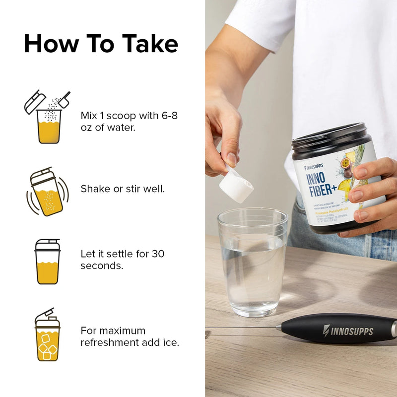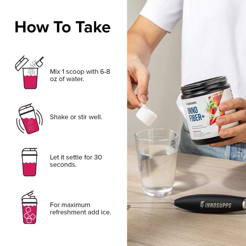 Add one scoop of Inno Fiber+ to 6-8 oz of cold water. Starting out? Use half a scoop for the first 3-5 days.